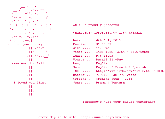 Voir le nfo de la release Shane.1953.1080p.BluRay.x264-AMIABLE