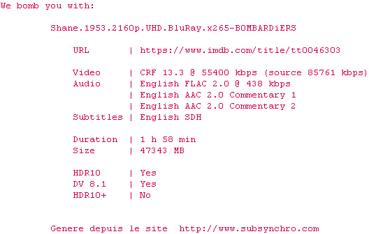 Voir le nfo de la release Shane.1953.2160p.UHD.BluRay.H265-MALUS