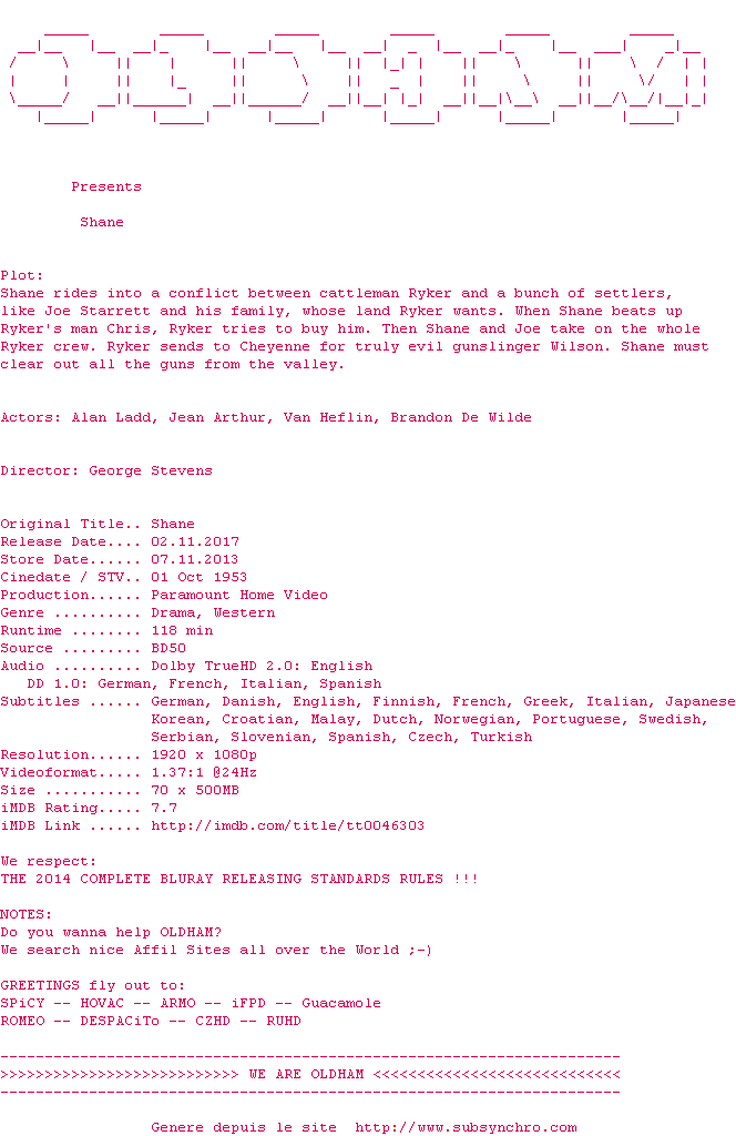 Voir le nfo de la release Shane.1953.COMPLETE.BLURAY-OLDHAM