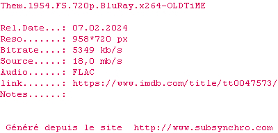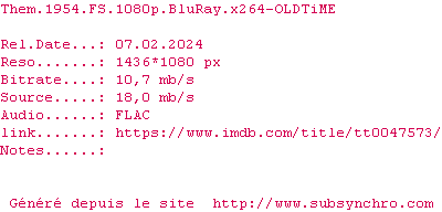 | OLDTiME | Them.1954.FS.BDRip.x264-OLDTiME OpenSubtitles | 0 fichier | |||
