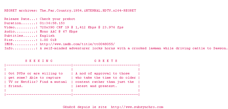 Voir le nfo de la release The.Far.Country.1954.iNTERNAL.HDTV.x264-REGRET