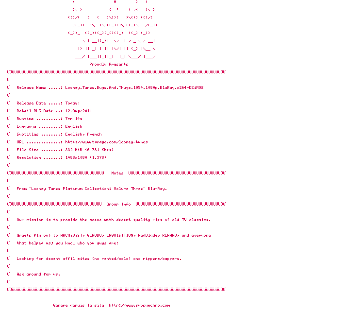 Voir le nfo de la release Looney.Tunes.Bugs.And.Thugs.1954.1080p.BluRay.x264-DEiMOS