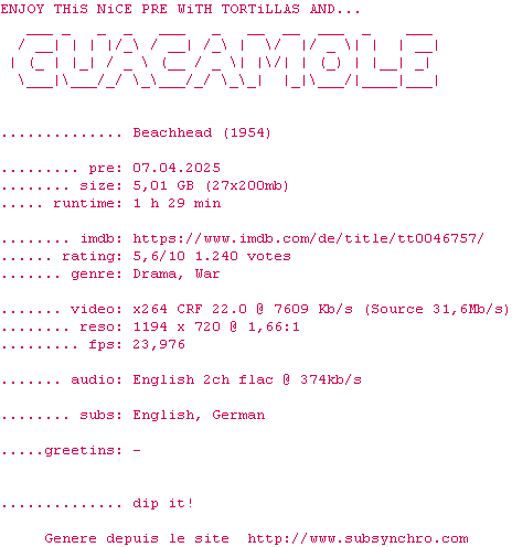 Voir le nfo de la release Beachhead.1954.MULTi.COMPLETE.BLURAY-LIM