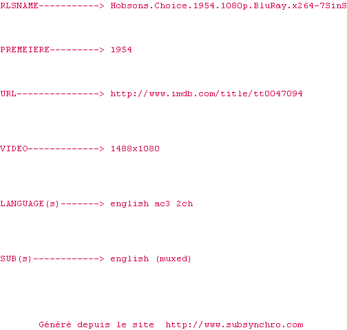 | Voir le nfo de la release Hobsons.Choice.1954.1080p.BluRay.x264-7SinS | 7SinS | Hobsons.Choice.1954.1080p.BluRay.x264-7SinS OpenSubtitles | 0 fichier | ||