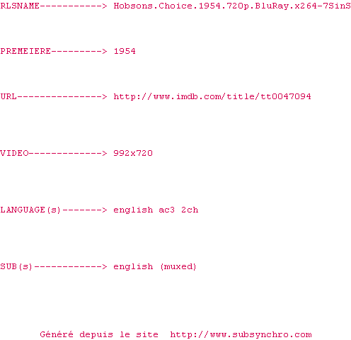 | Voir le nfo de la release Hobsons.Choice.1954.720p.BluRay.x264-7SinS | 7SinS | Hobsons.Choice.1954.720p.BluRay.x264-7SinS OpenSubtitles | 0 fichier | ||