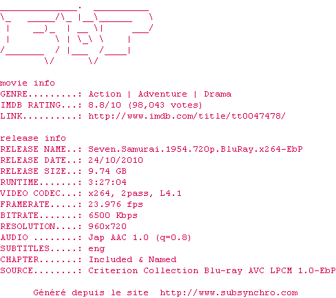 Seven.Samurai.1954.720p.BluRay.x264-EbP.fre.srt Ajouté par SubSynchro Ajoute le 26-02-2011 00:38:10 Format : SRT Italique : Non Taille : 0.00Ko Telechargement : 285 Merci àspaceboy74 Ajouter cette release à ma collection en cas de telechargement des sous-titres 0 0 0 Telecharger le ZiP contenant NFO, Affiche, Sous-titre (*.srt) Commentez le fichier Seven.Samurai.1954.720p.BluRay.x264-EbP.fre.srt Commentez le fichier Seven.Samurai.1954.720p.BluRay.x264-EbP.fre.srt Commentez ce fichier Le fichier 1-1298677230.srt n'existe pas ! Telechargez le RSS « Fichier de la release Seven.Samurai.1954.720p.BluRay.x264-EbP » Retour au film « Les 7 Samouraïs / Les Sept Samouraïs »