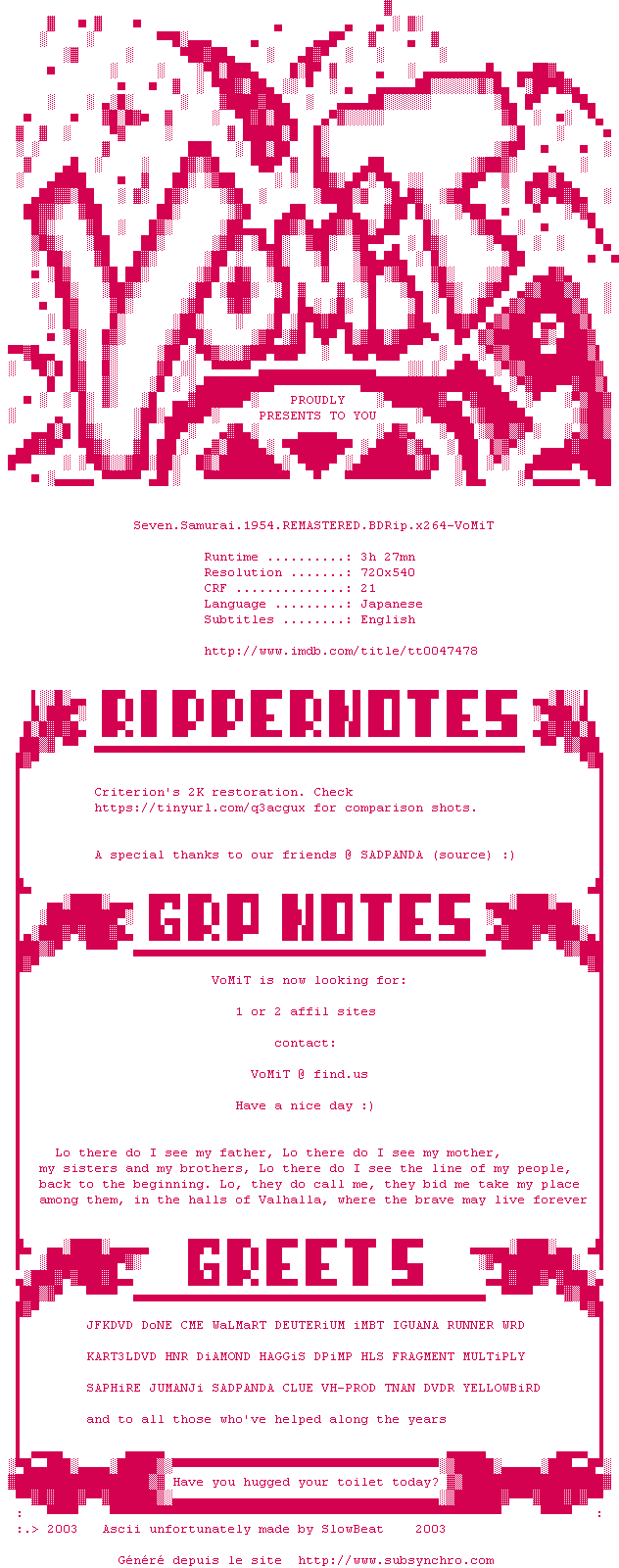 Y avez-vous pense ? Nous proposons déjà 8 sous-titres pour le film Les 7 Samouraïs / Les Sept Samouraïs. Avez-vous essaye de voir si ces sous-titres etaient compatibles avec cette release ? On vous laisse le soin de tester cela pour nous et de contribuer au site en postant le sous-titre en cas de compatiblite constatee !