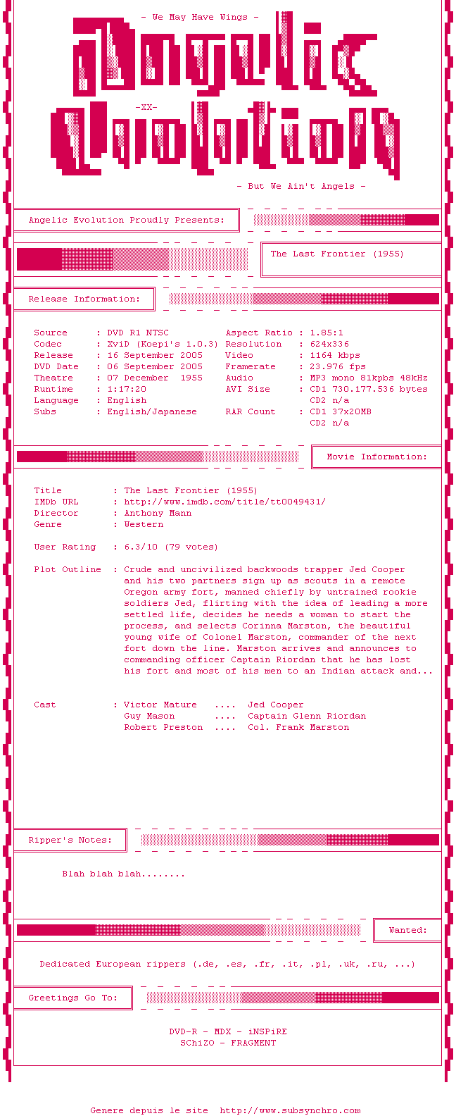 Voir le nfo de la release The.Last.Frontier.1955.DVDRip.XviD-AEN