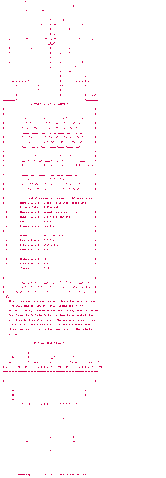 | Voir le nfo de la release Looney.Tunes.Stork.Naked.1955.BDRip.x264-WaLMaRT | WaLMaRT | Looney.Tunes.Stork.Naked.1955.BDRip.x264-WaLMaRT OpenSubtitles | 0 fichier |