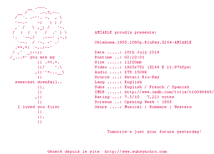 | Voir le nfo de la release Oklahoma.1955.720p.BluRay.X264-AMIABLE | AMIABLE | Oklahoma.1955.720p.BluRay.X264-AMIABLE OpenSubtitles | 0 fichier |