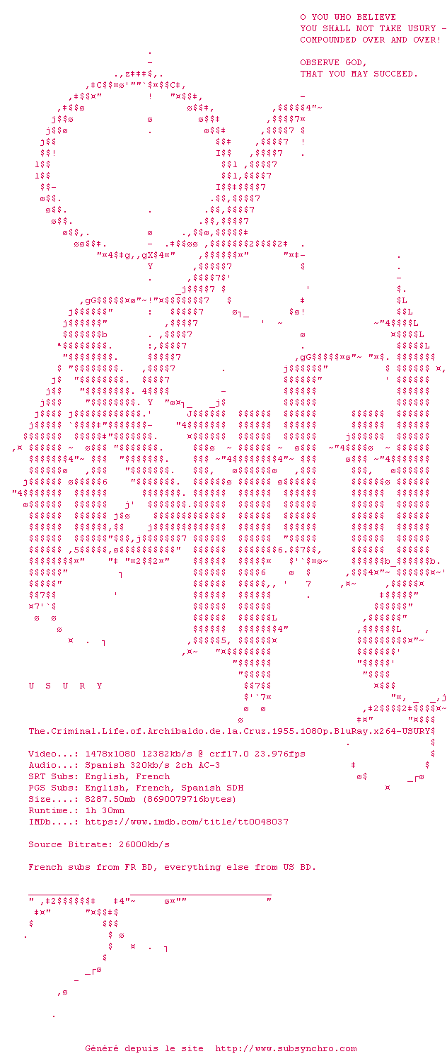 Voir le nfo de la release The.Criminal.Life.Of.Archibaldo.De.La.Cruz.1955.1080p.BluRay.x264-USURY