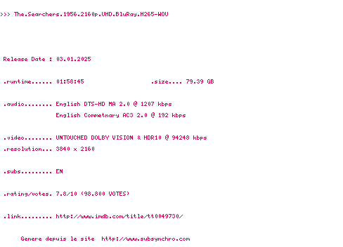Voir le nfo de la release The.Searchers.1956.MULTi.2160p.UHD.BluRay.x265-UKDHD