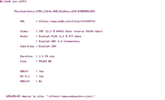 Voir le nfo de la release The.Searchers.1956.2160p.UHD.BluRay.x265-B0MBARDiERS