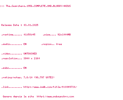 Voir le nfo de la release The.Searchers.1956.COMPLETE.UHD.BLURAY-4KDVS