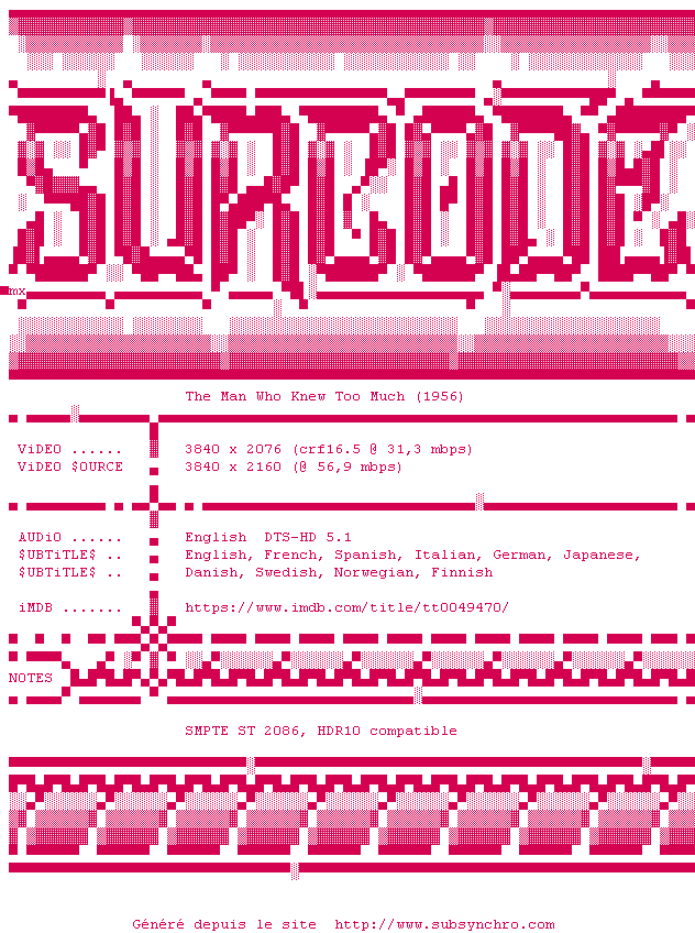 Voir le nfo de la release The.Man.Who.Knew.Too.Much.1956.2160p.UHD.BluRay.x265-SURCODE