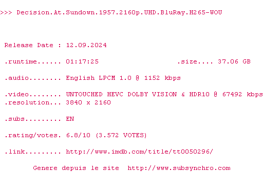 Voir le nfo de la release Decision.At.Sundown.1957.2160p.UHD.BluRay.H265-WOU