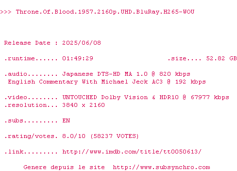 Voir le nfo de la release Throne.Of.Blood.1957.2160p.UHD.BluRay.H265-WOU
