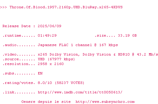 Voir le nfo de la release Throne.Of.Blood.1957.2160p.UHD.BluRay.x265-4KDVS