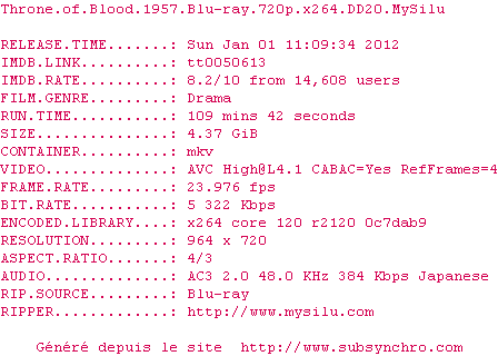 Voir le nfo de la release Throne.of.Blood.1957.Blu-ray.720p.x264.DD20-MySilu