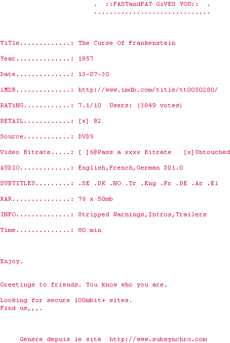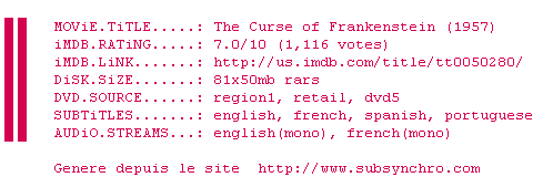 Voir le nfo de la release The.Curse.Of.Frankenstein.1957.NTSC-DVDR
