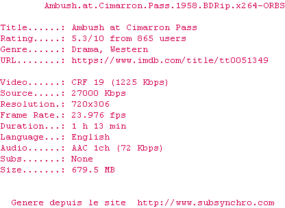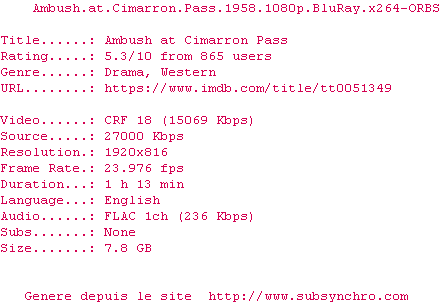 Voir le nfo de la release Ambush.At.Cimarron.Pass.1958.1080p.BluRay.x264-ORBS