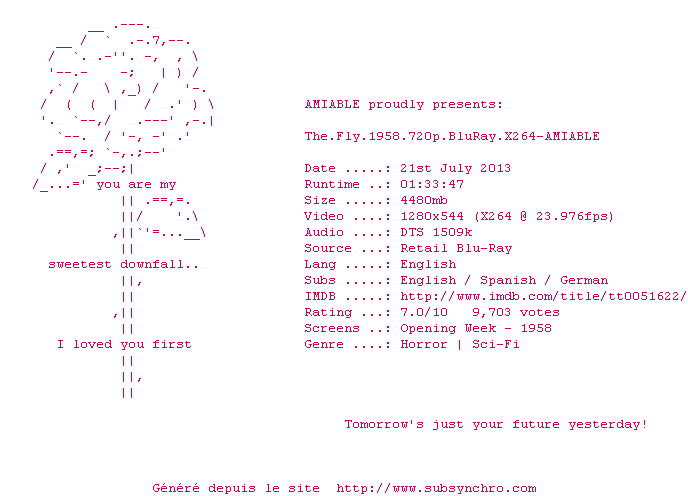 | Voir le nfo de la release The.Fly.1958.720p.BluRay.X264-AMIABLE | AMIABLE | The.Fly.1958.720p.BluRay.X264-AMIABLE OpenSubtitles | 24/07/2013 | Disponible en Z1 | 1 fichier |