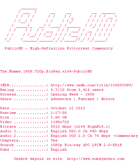 Voir le nfo de la release The.Mummy.1959.720p.BluRay.x264-PublicHD