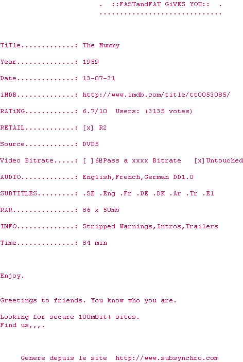 Y avez-vous pense ? Nous proposons déjà 1800 sous-titres pour le film La Malédiction des pharaons. Avez-vous essaye de voir si ces sous-titres etaient compatibles avec cette release ? On vous laisse le soin de tester cela pour nous et de contribuer au site en postant le sous-titre en cas de compatiblite constatee !