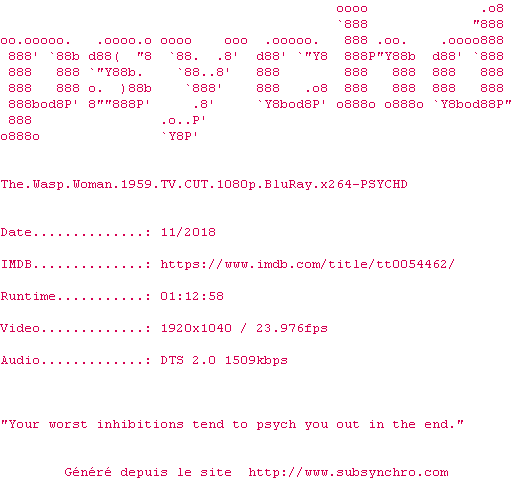 | PSYCHD | The.Wasp.Woman.1959.THEATRICAL.CUT.1080p.BluRay.x264-PSYCHD OpenSubtitles | 0 fichier | |||