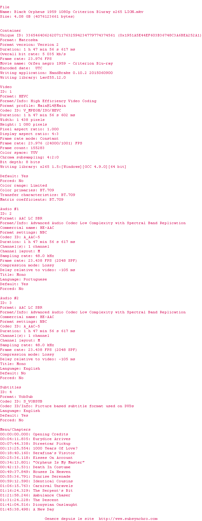 Y avez-vous pense ? Nous proposons déjà 1954 sous-titres pour le film Orfeu negro. Avez-vous essaye de voir si ces sous-titres etaient compatibles avec cette release ? On vous laisse le soin de tester cela pour nous et de contribuer au site en postant le sous-titre en cas de compatiblite constatee !