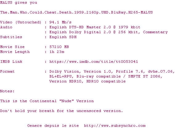 Voir le nfo de la release The.Man.Who.Could.Cheat.Death.1959.2160p.UHD.BluRay.H265-MALUS