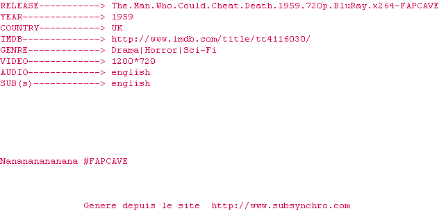 Voir le nfo de la release The.Man.Who.Could.Cheat.Death.1959.720p.BluRay.x264-FAPCAVE