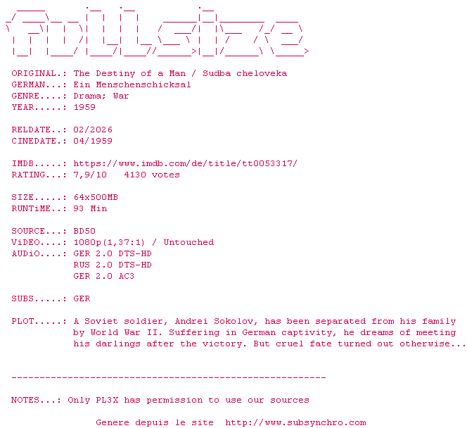 Telechargez le RSS « Fichier de la release The.Destiny.Of.A.Man.1959.COMPLETE.BLURAY-FULLSiZE »