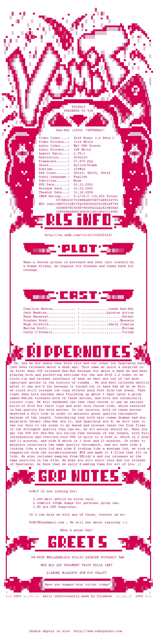 Voir le nfo de la release Ben.Hur.1959.INTERNAL.DVDRip.XviD-VoMiT