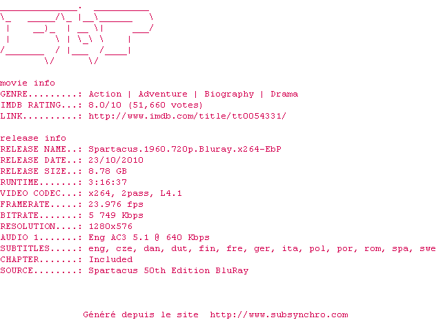 Voir le nfo de la release Spartacus.1960.720p.Bluray.x264-EbP