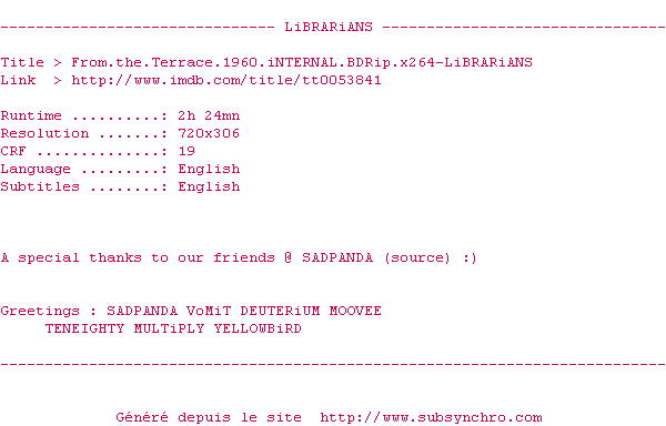 Voir le nfo de la release From.The.Terrace.1960.iNTERNAL.BDRip.x264-LiBRARiANS