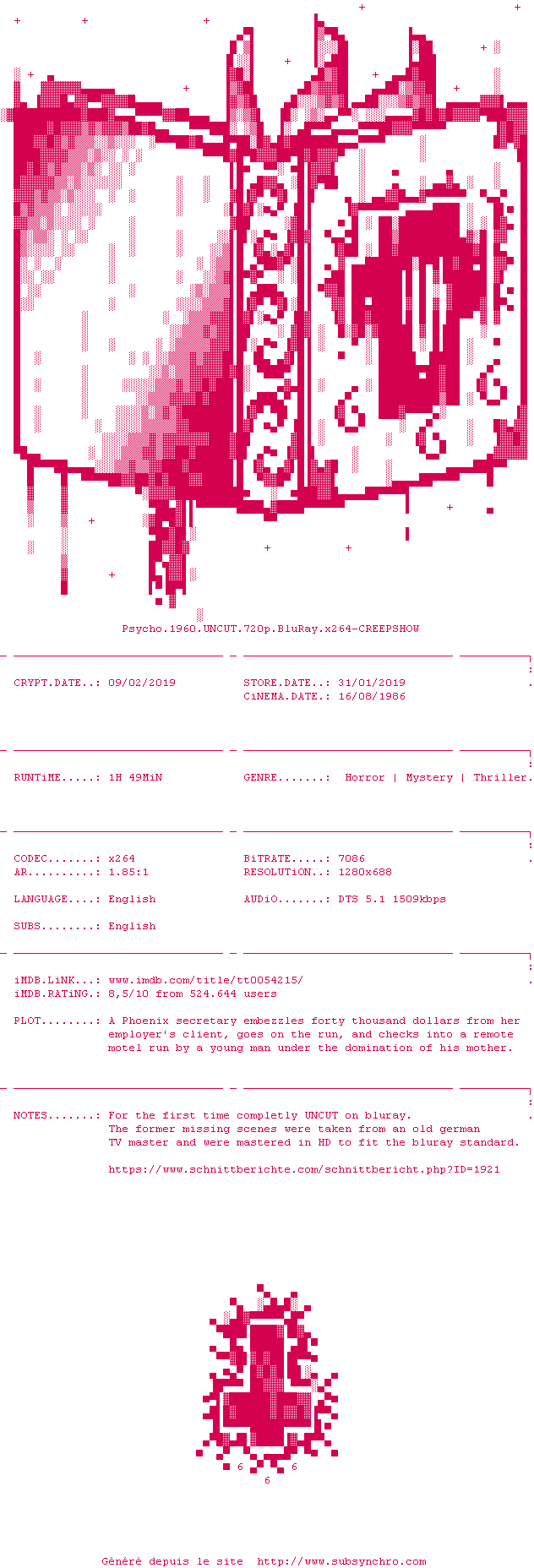 Très vite la panique commence à se faire sentir. Partagée entre l'angoisse de se faire prendre et l'excitation de mener une nouvelle vie, Marion roule vers une destination qu'elle n'atteindra jamais. La pluie est battante, la jeune femme s'arrête près d'un motel, tenu par un sympathique gérant nommé Norman Bates, mais qui doit supporter le caractère possessif de sa mère.