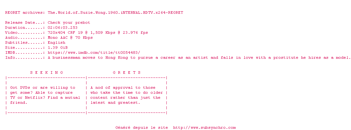 Voir le nfo de la release The.World.Of.Suzie.Wong.1960.iNTERNAL.HDTV.x264-REGRET