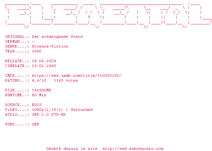 Voir le nfo de la release Der.Schweigende.Stern.1960.German.1080p.BluRay.AVC-ELEMENTAL