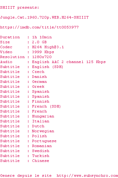 Y avez-vous pense ? Nous proposons déjà 2001 sous-titres pour le film Le jaguar, seigneur de l'amazone. Avez-vous essaye de voir si ces sous-titres etaient compatibles avec cette release ? On vous laisse le soin de tester cela pour nous et de contribuer au site en postant le sous-titre en cas de compatiblite constatee !