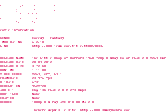 | Voir le nfo de la release The.Little.Shop.of.Horrors.1960.720p.BluRay.Color.FLAC.2.0.x264-EbP | EbP | The.Little.Shop.of.Horrors.1960.720p.BluRay.Color.FLAC.2.0.x264-EbP OpenSubtitles | 16/05/2012 | 1 fichier | |