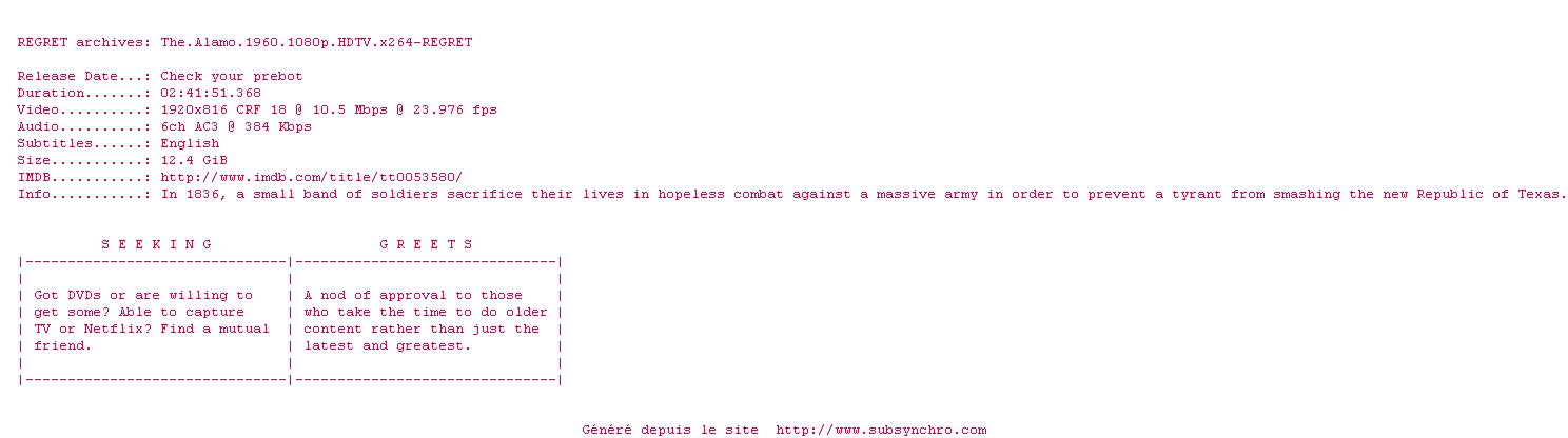 Voir le nfo de la release The.Alamo.1960.1080p.HDTV.x264-REGRET