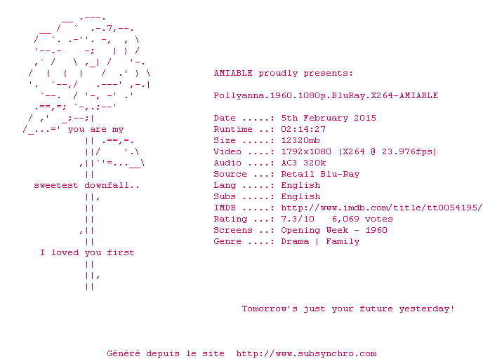 Telechargez le RSS « Fichier de la release Pollyanna.1960.1080p.BluRay.X264-AMIABLE »