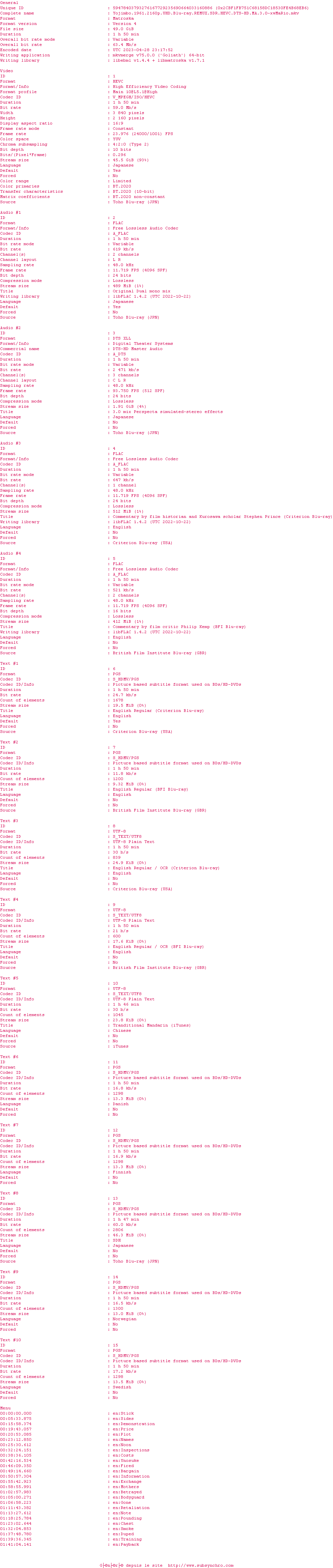 Voir le nfo de la release Yojimbo.1961.2160p.UHD.Blu-ray.REMUX.SDR.HEVC.DTS-HD.MA.3.0-xwMaRio
