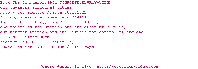 Y avez-vous pense ? Nous proposons déjà 1898 sous-titres pour le film La ruée des Vikings / Erik the Conqueror. Avez-vous essaye de voir si ces sous-titres etaient compatibles avec cette release ? On vous laisse le soin de tester cela pour nous et de contribuer au site en postant le sous-titre en cas de compatiblite constatee !