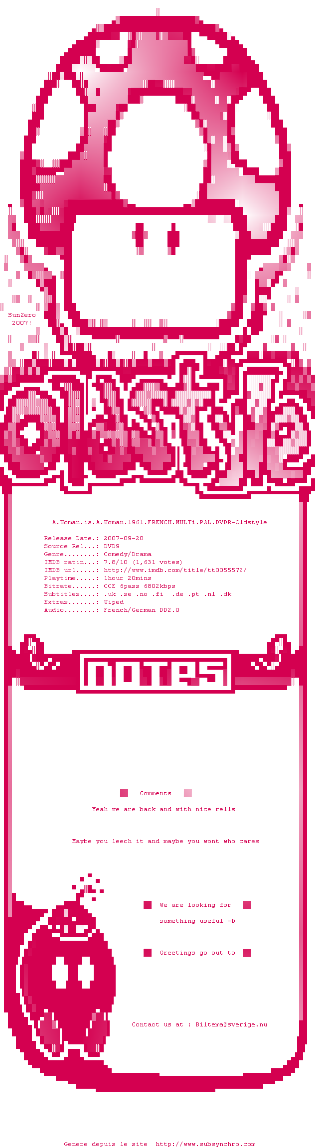 Voir le nfo de la release A.Woman.Is.A.Woman.1961.FRENCH.MULTi.PAL.DVDR-Oldstyle
