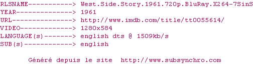 Telechargez le RSS « Fichier de la release West.Side.Story.1961.720p.BluRay.X264-7SinS »
