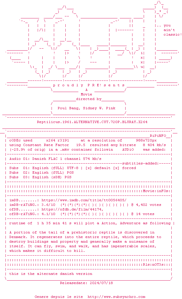 Voir le nfo de la release Reptilicus.1961.ALTERNATIVE.CUT.1080P.BLURAY.x264-WATCHABLE
