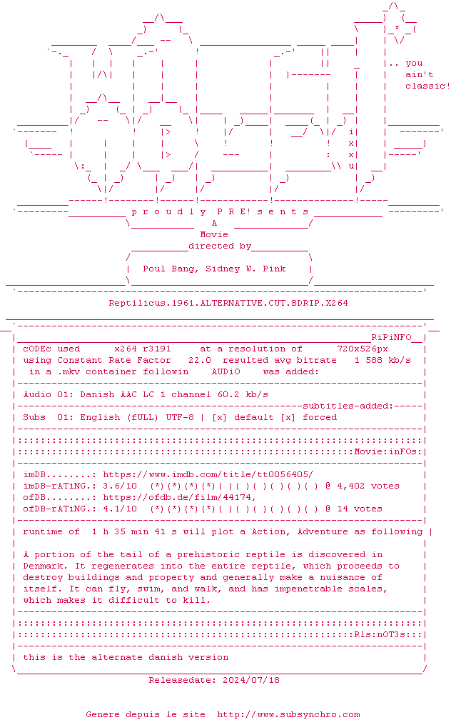 Voir le nfo de la release Reptilicus.1961.ALTERNATIVE.CUT.BDRIP.x264-WATCHABLE