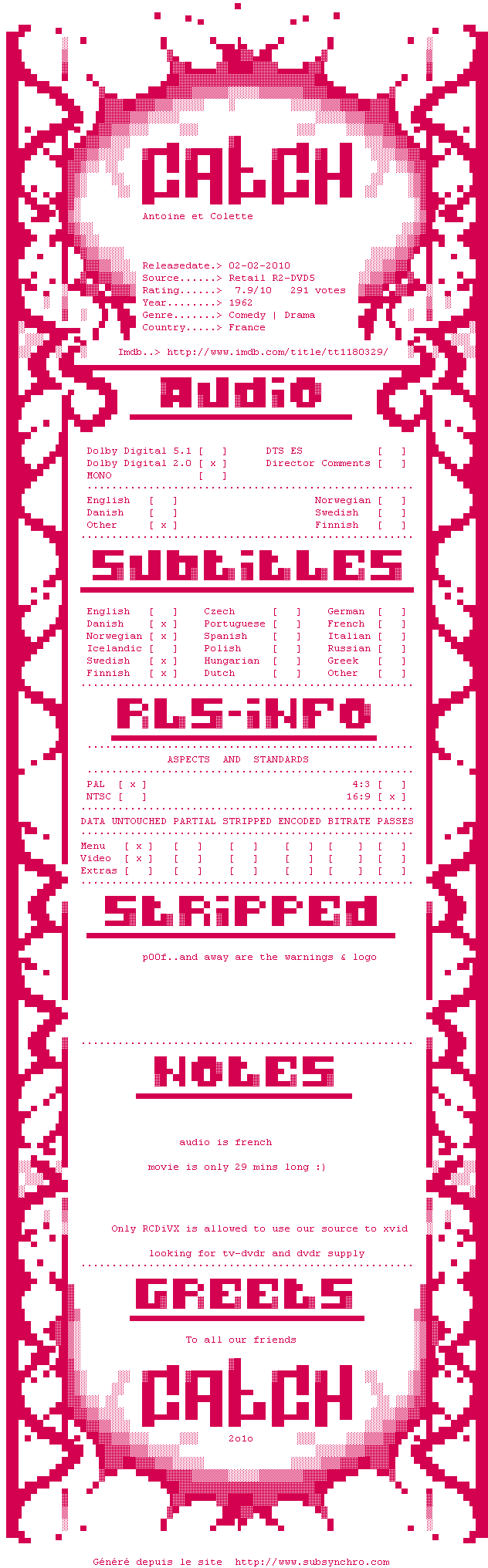 Voir le nfo de la release Antoine.Et.Colette.1962.NORDiC.PAL.DVDR-CATCH